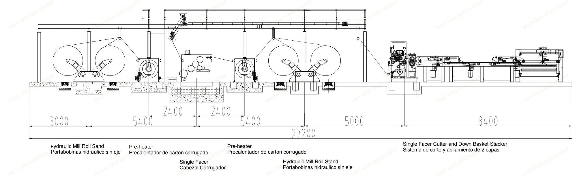 Basic single face corrugated sheet production line is mainly composed of mechanical shaftless mill roll stand or hydraulic shaftless mill roll stand, single facer and swing stacking machine.